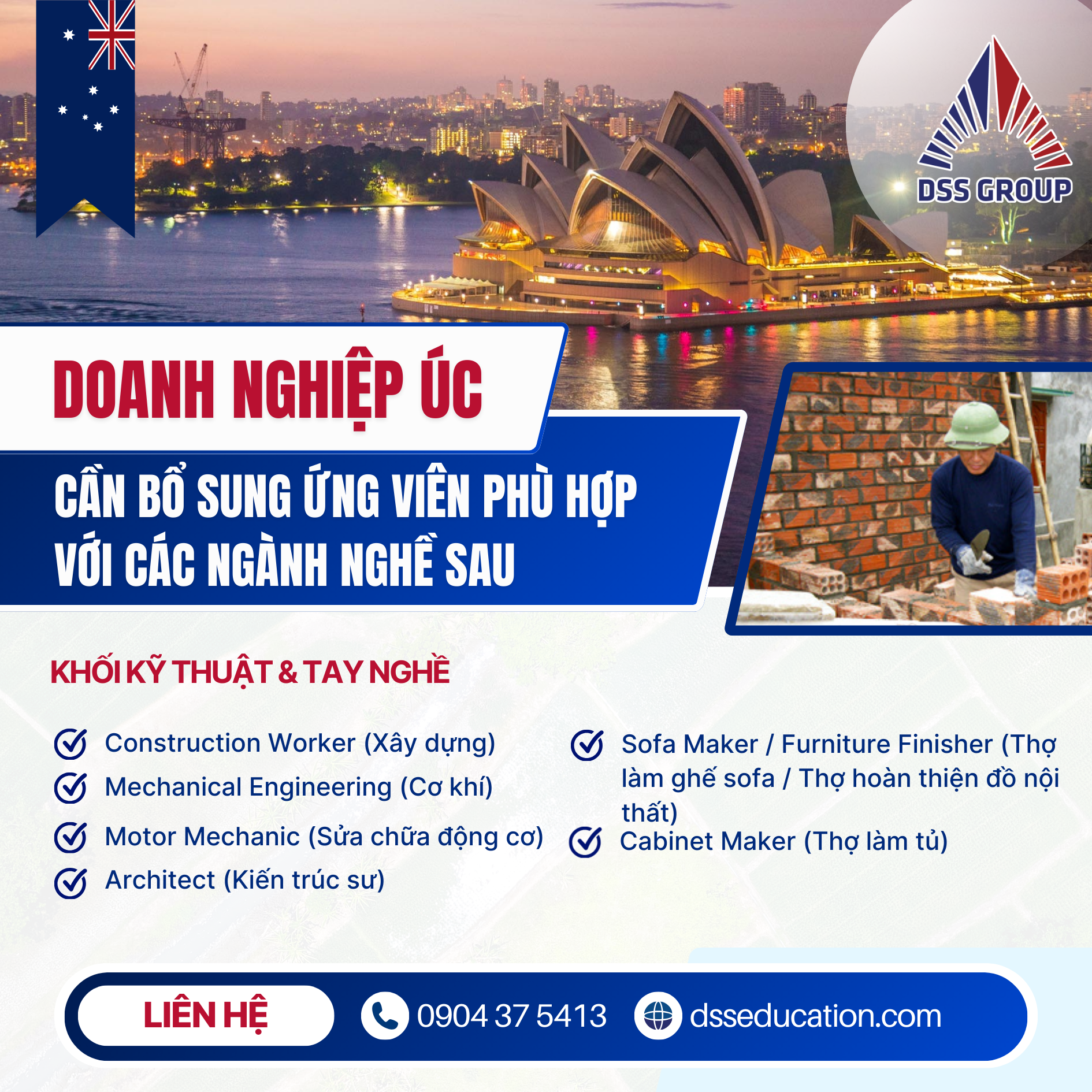Với mạng lưới hợp tác cùng nhiều doanh nghiệp uy tín tại Úc, DSS tự hào là đơn vị đồng hành và hỗ trợ ứng viên trong việc tiếp cận chương trình đào tạo, đánh giá tay nghề và định hướng nghề nghiệp theo chuẩn Úc – mở rộng cơ hội làm việc và định cư trong tương lai.