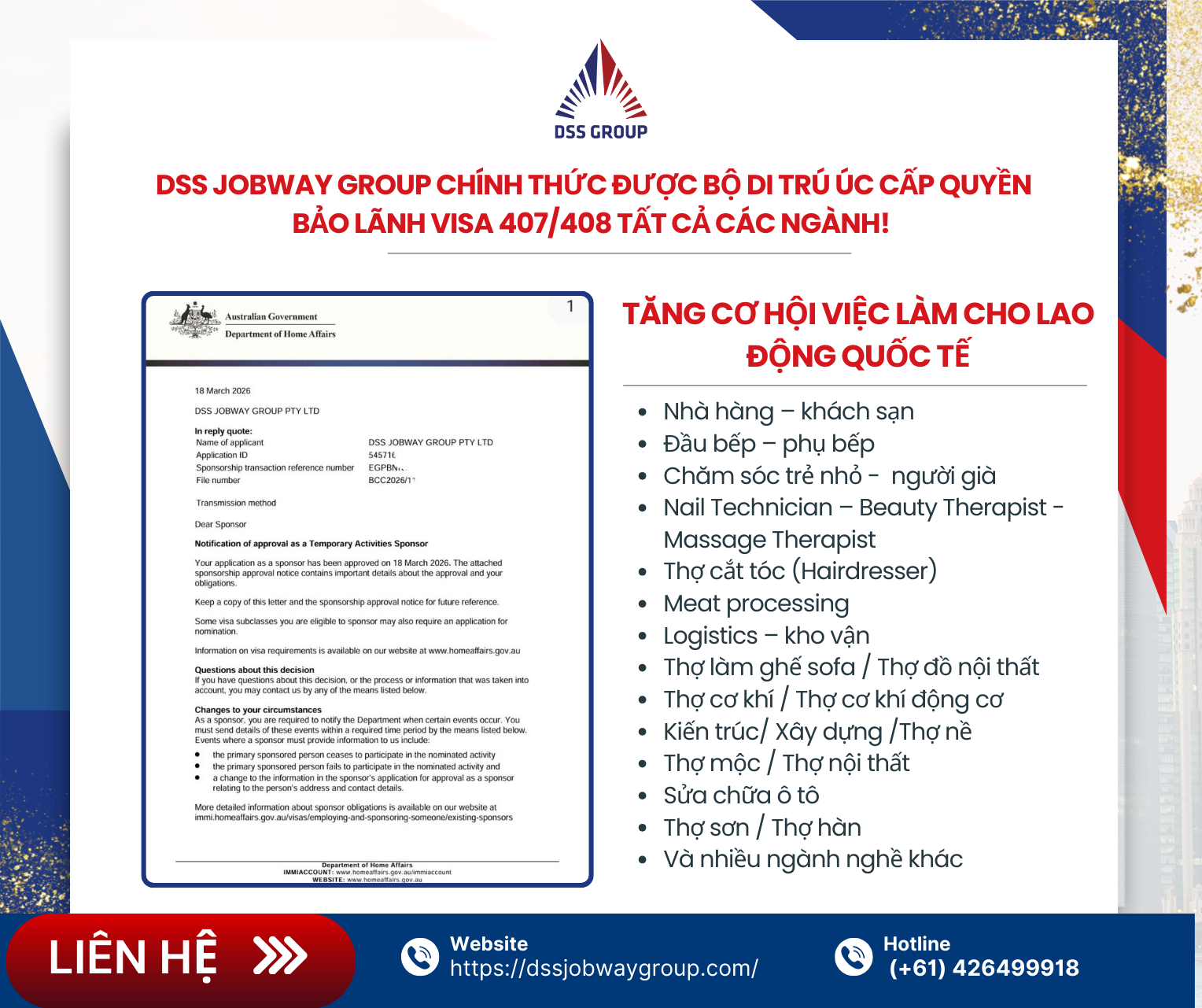📌 Nếu bạn đang tìm kiếm con đường sang Úc hợp pháp, được doanh nghiệp bảo lãnh làm việc và có cơ hội định cư dài hạn, hãy liên hệ ngay DSS Group để được tư vấn và thiết lập lộ trình phù hợp nhất cho bạn.