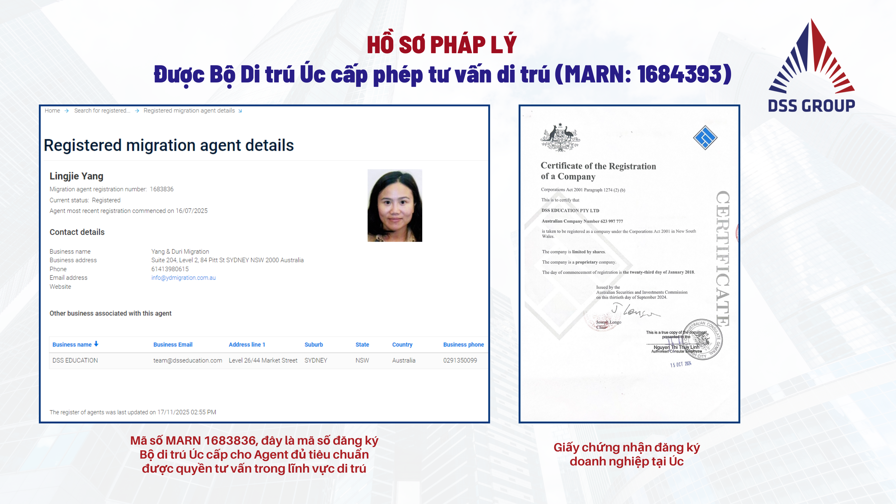 Cả 2 công ty DSS Education Úc và Việt Nam được trực tiếp cố vấn bởi cố vấn di trú Lingjie Yang, Đồng sáng lập Tổ chức Yang & Duri Migration có trụ sở tại nhiều quốc gia trên thế giới (mã số MARN 1683836).