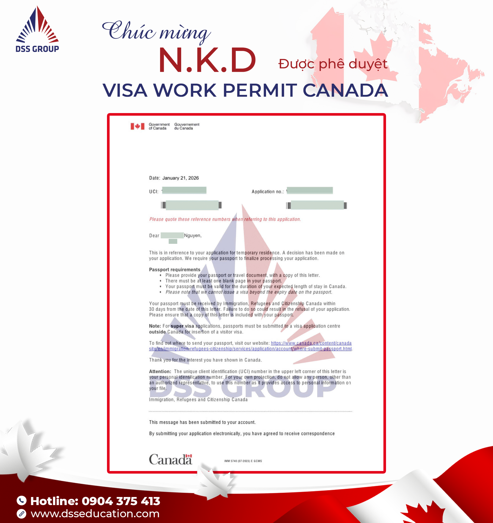 Ngay trong những ngày đầu năm mới 2026, DSS Group tự hào thông báo: anh N.K.D đã chính thức nhận được Thư yêu cầu dán Visa Work Permit Canada ngành Cook (Đầu bếp), chính thức mở ra hành trình sự nghiệp mới tại xứ sở lá phong.